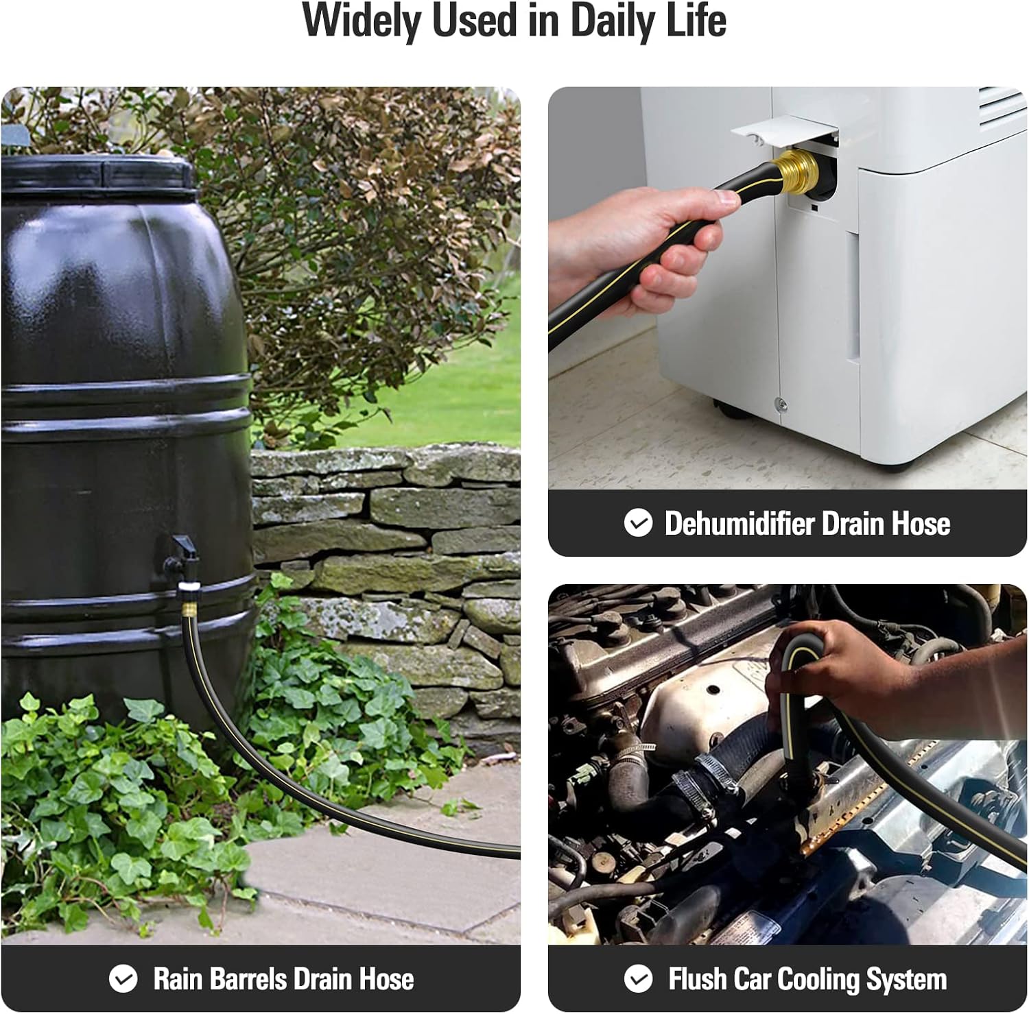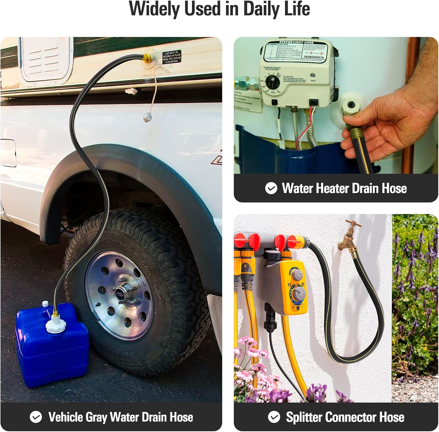 - Multifunctional: Available in various sizes, this product is ideal for a wide range of applications, including hose reel carts, RVs, dehumidifier hoses, laundry tub hoses, water softeners, washing machines, rain barrel drain hoses, short water hoses for pool cover pumps, and drain hoses for fishbowls and sinks; It effectively directs water to your bucket while minimizing splashing and mess
