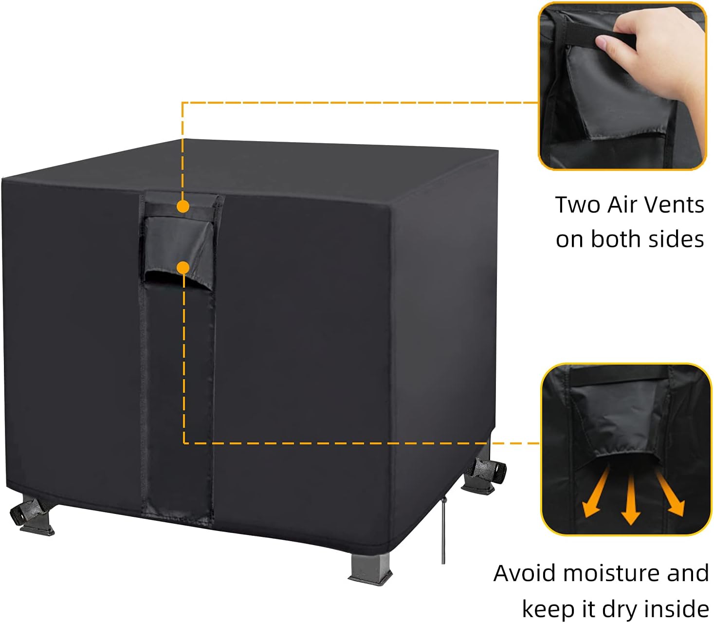 - [RIP RESISTANT AND UV PROTECTION]: Elastic hem cord and straps allow for a custom secure fit. Fire pit cover round 4 built-in buckle straps on on diagonal sides to lock around the fire pit legs, make the cover stay firmly in strong wind, especially in severe weather. Add with Air Vent and Handle. Plus the design of air vent and handle, help the internal air circulation, make it more convenient for you to use