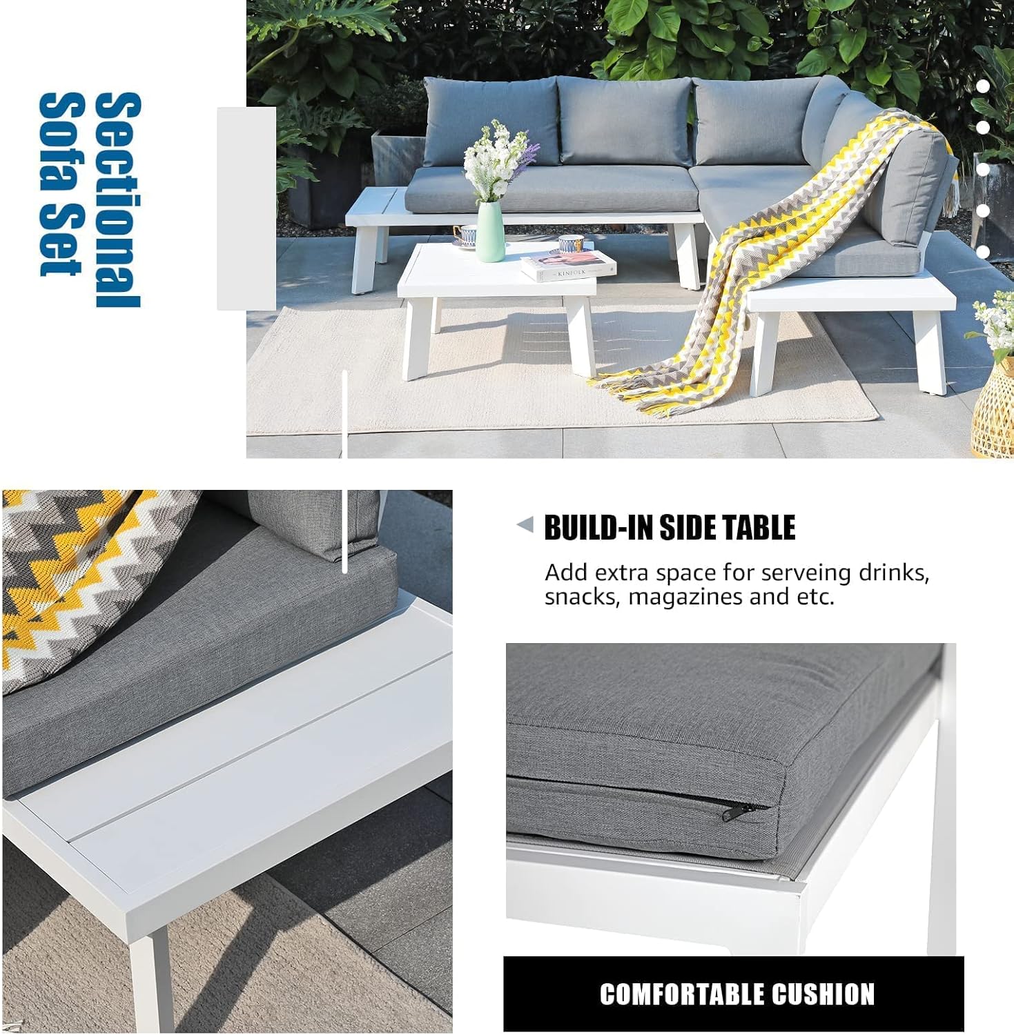 - FUNCTIONAL DETAILS - The L-shaped patio furniture offers built-in side tables at the end on each side, adding extra space to place drinks or other items. Adjustable feet at the bottom of table and chairs are used for helping with un-even surfaces to keep the furniture stability.