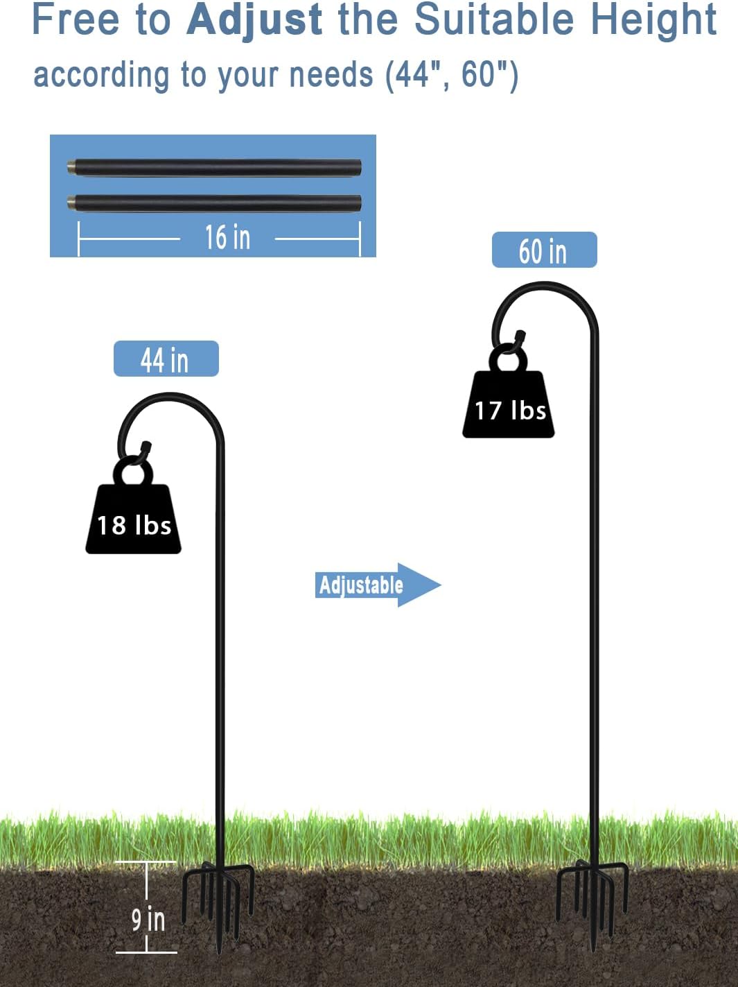 - Extendable & Tall Hook Hanger: The outside shepherd’s hook hanger made of 3/5 inch width & 2mm thickened steel pipe with 7 solid anchor points, you can free to adjust the suitable height for 60 " or 44 ", and also make it stands firmly in the ground without easily falling down, no fear of severe weather such as strong winds, heavy rains, and blizzards, (1 PACK / SET)
