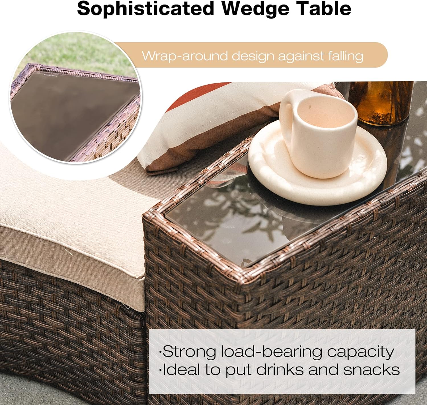 - HANDCRAFTED ALL-WEATHER WICKER - The faux rattan gives the look and texture of natural rattan with the durability and UV resistant of resin. Constructed from beautifully woven wicker, the sectional sofa set fits together to create a curved shaped lounge with 4 matching side tables.