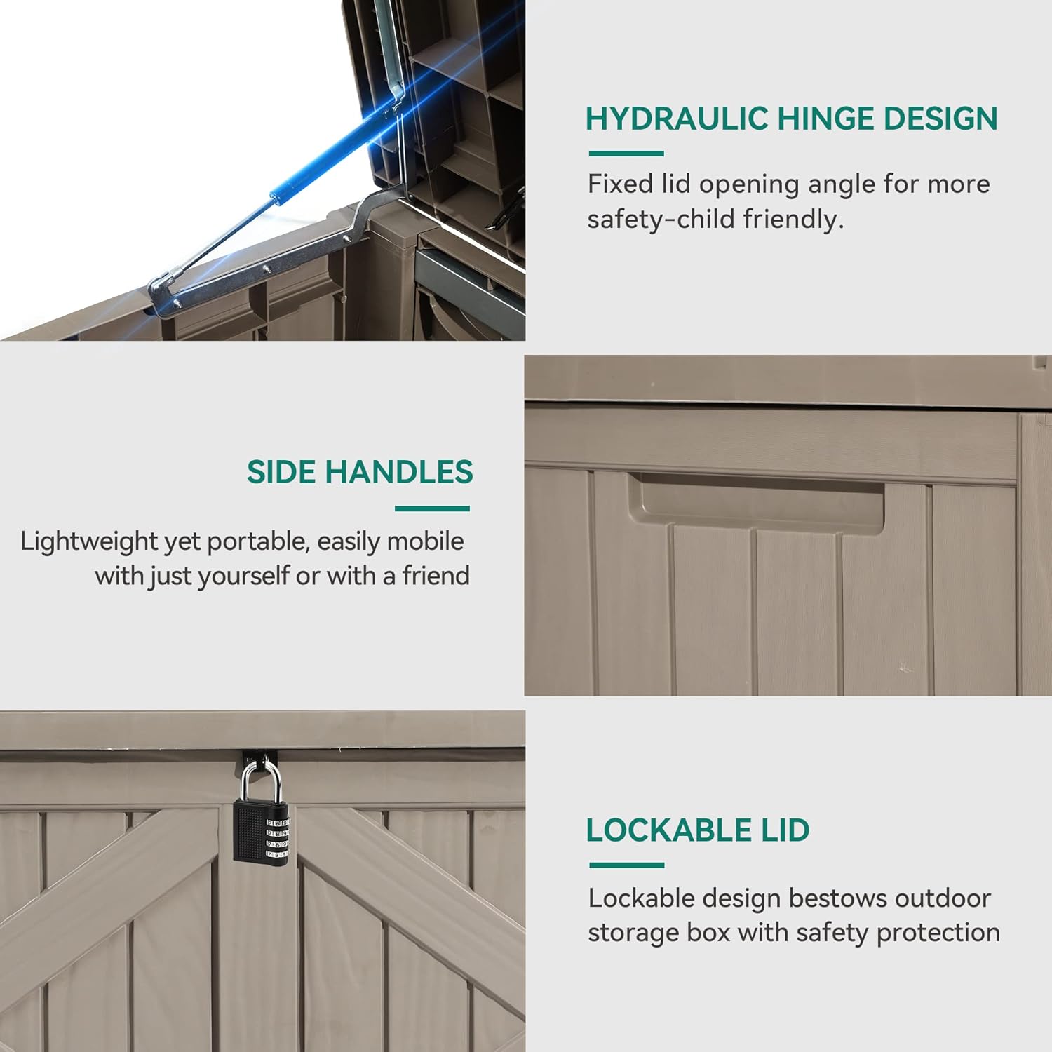 - EASY TO USE- Hydraulic hinge provides smooth, anti-slam closing; Itβs easy to reposition thanks to the built-in handles, and secure your items with lockable lid; Two people assembly in 10 mins with tools included.