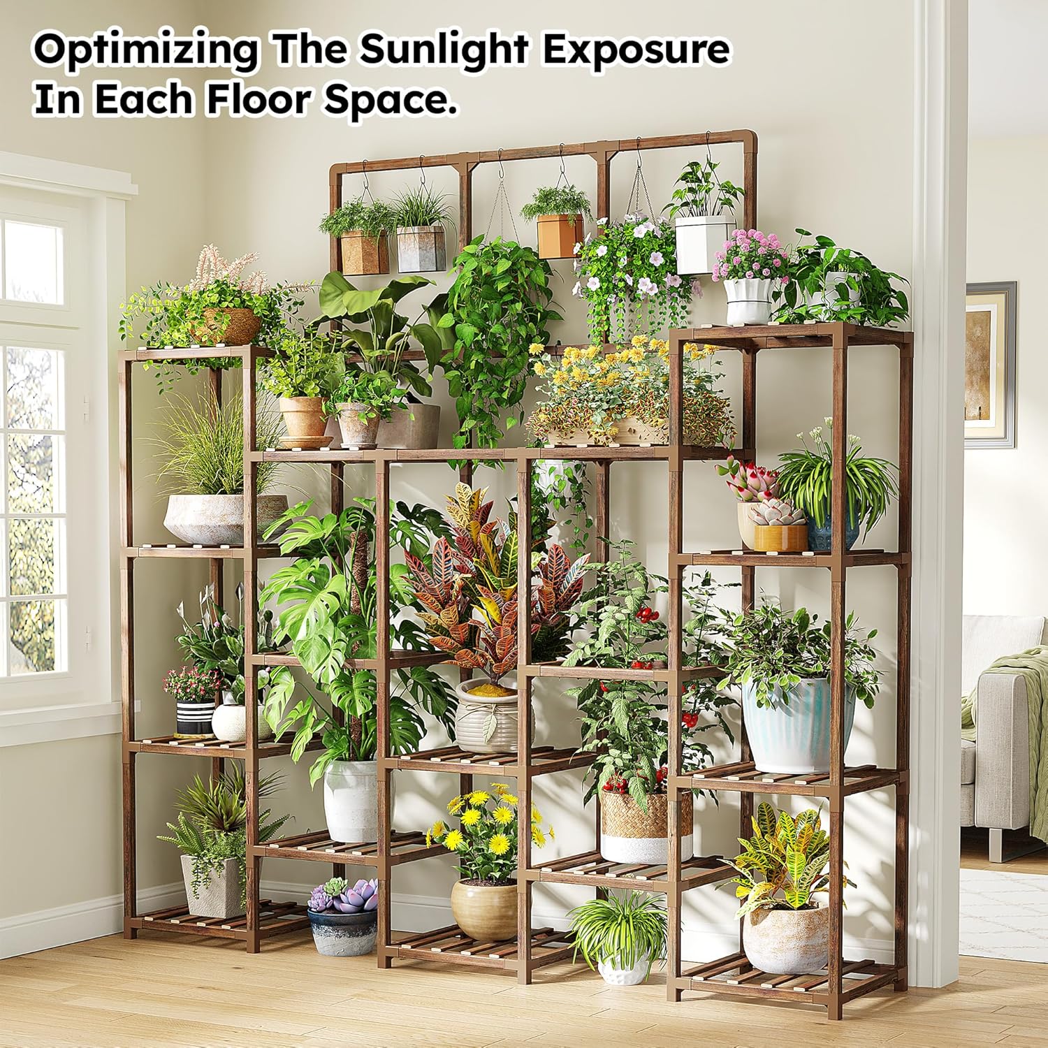 - 【Large Capacity Plant Stand for 18-23 Pots and Space Saving Genius】Carefully designed wider shelves effortlessly hold more than 18 pots, providing a more spacious growing area for your tall plants, short plants, small pots or hanging plants etc, making each plant can stand in sunshine, absorb the balanced nutrients and sunlight in a comfortable environment. Open-frame design promotes air circulation and sunlight exposure, boosting plant health while adding chic decor. Maximize your greenery’s potential—revive your oasis now
