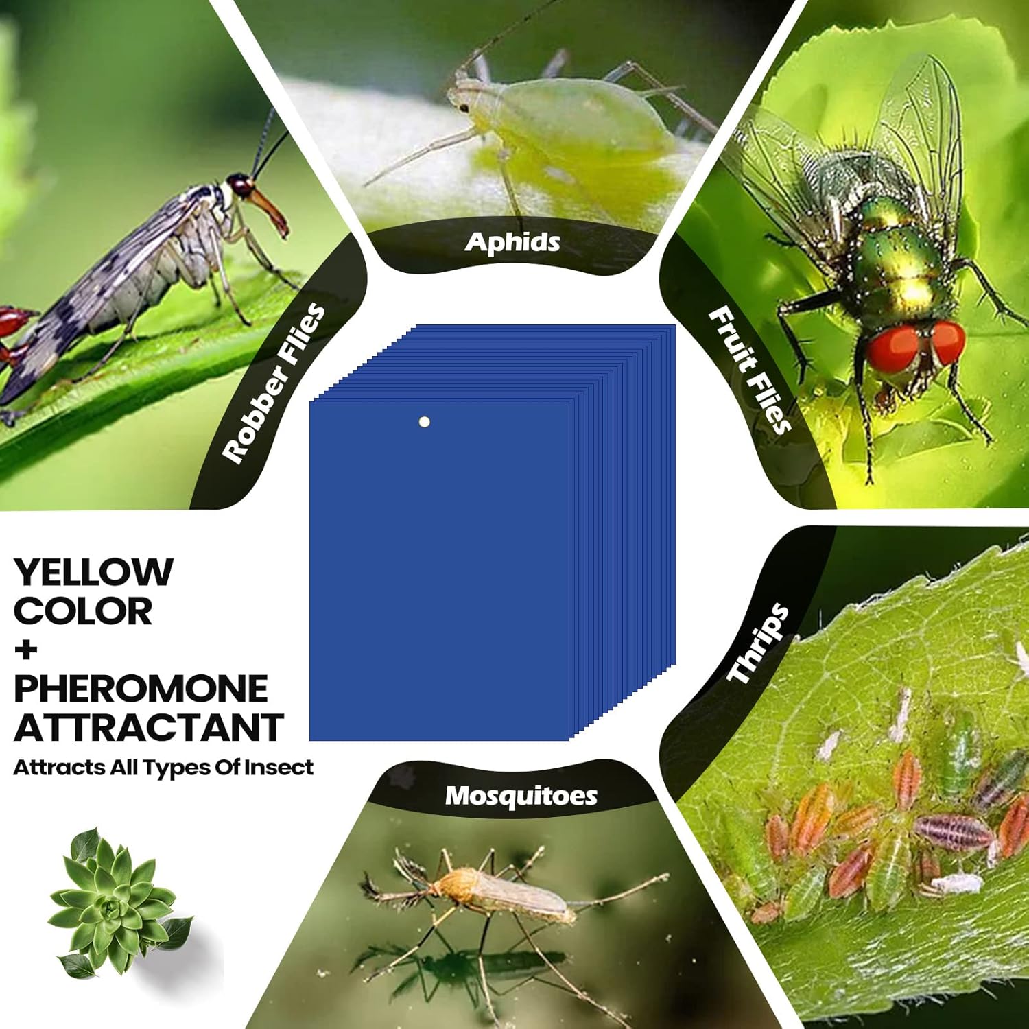 - Double Sided Stickiness: our blue sticky traps are designed to be double sided, widely capture the most pests, includes white flies, leaf miners, fungus gnats, shore flies, midges, mosquitoes, and other flying insects, you can place them in the garden, lawn, yard, next to the trash can and so on