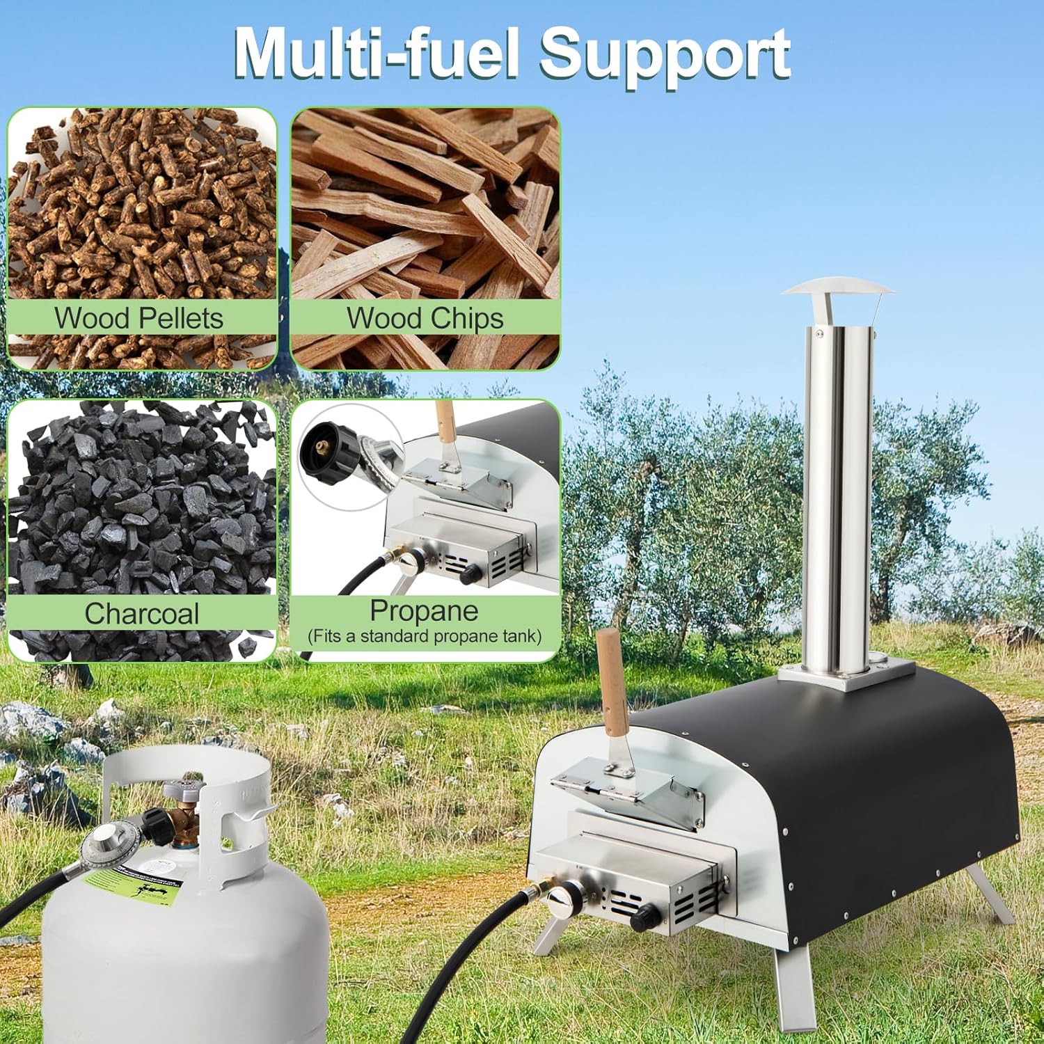 - 【Multi-fuel Support】: This pizza oven distinguishes itself by dual fuel burner design, including both propane and combustion fuels. The gas burner fits a standard propane tank for sustained heating. Plus, it works well with wood pellets, wood chips and charcoal to keep the original flavor of food. (Gas burner needs one AAA battery, which is not included in the package.)
