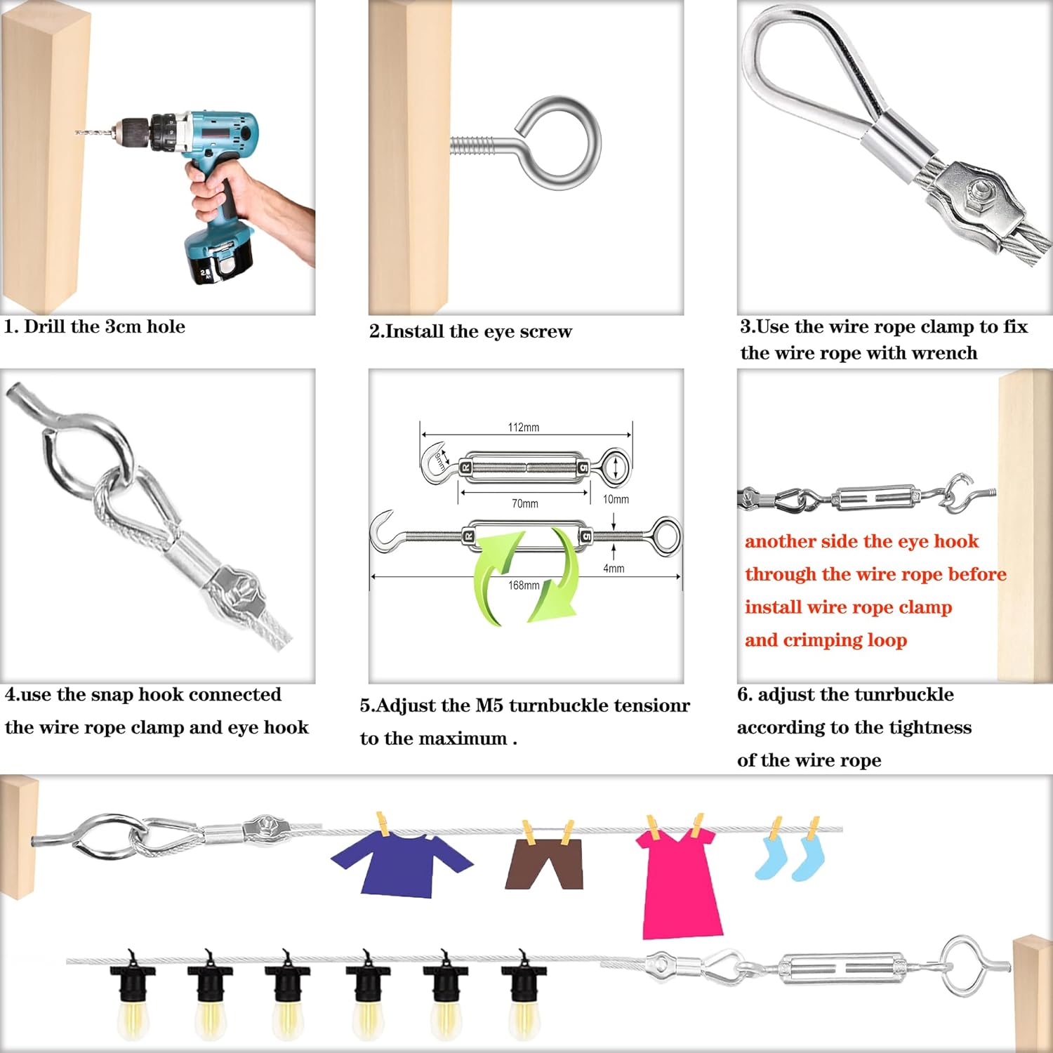 - 【1/8" Turnbuckles for Cables Wire 】:Include 50M 1/8 Wire Rope + 5Pcs M5 Turnbuckle Eye Hooks + 10PcsM5 Lag Screw Eye Hooks+10Pcs M3 Wire Rope Clamp +10Pcs M2 Wire Rope Thimbles+20Pcs M2 Aluminum Crimping Loop +3Pcs M5 Carabiner Hook+10Pcs Plastic Anchors+50Pcs Plastic Tie