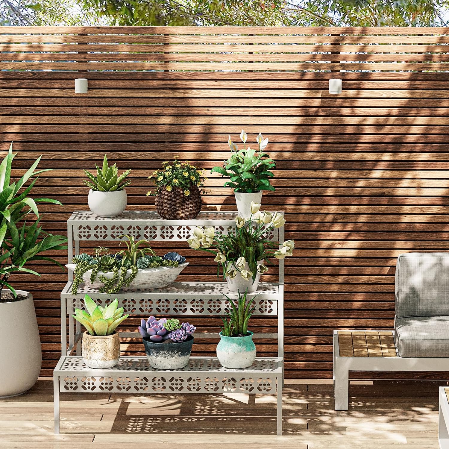 - 【3-Tier Plant Stand】This 3-tier plant stand has multiple functions, which is perfect for patio, garden, balcony, etc. The ladder style lets your plants get more air and sunlight.