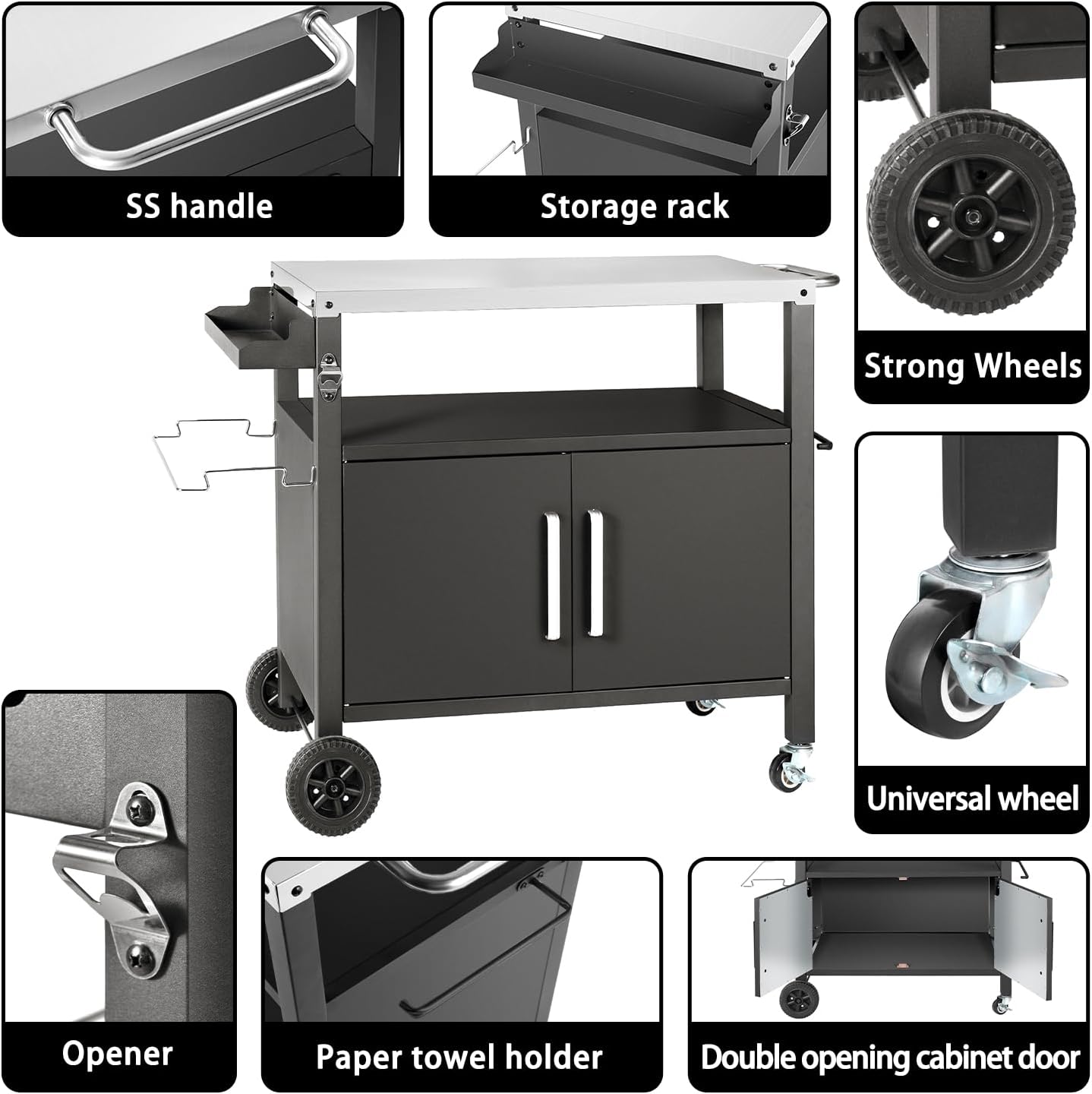 - ăAll in one Prep TableăThe outdoor BBQ grill table comes with 1pc removable garbage bag holder, 1pc paper towel holder,1pc beer opener, 1pc big side spice rack and 1side handle for keeping towel or move it anywhere and one big storage cabinet.