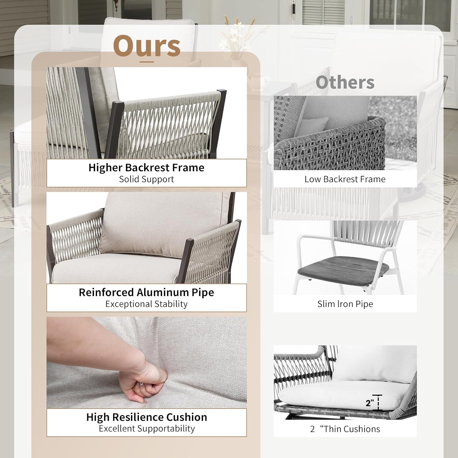 - Versatile Configurations for Any Space: Whether you have a small apartment balcony or a spacious backyard, this outdoor furniture clearance collection offers various configurations to suit your needs. With options ranging from compact balcony furniture sets to larger arrangements, you can find the perfect fit for your space. Plus, our exceptional customer service is always available to assist you, ensuring a satisfying experience with your new wicker patio set