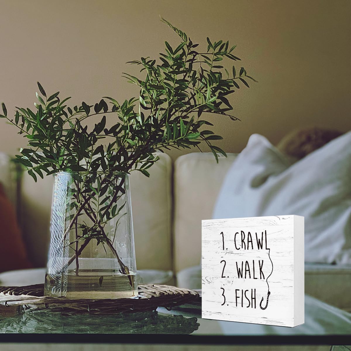 White Crawl Walk Fish Rustic Wooden Sign Desk Decor, Funny Baby Fishing Wood Block Sign for Home Bedroom Baby Room Shelf Table