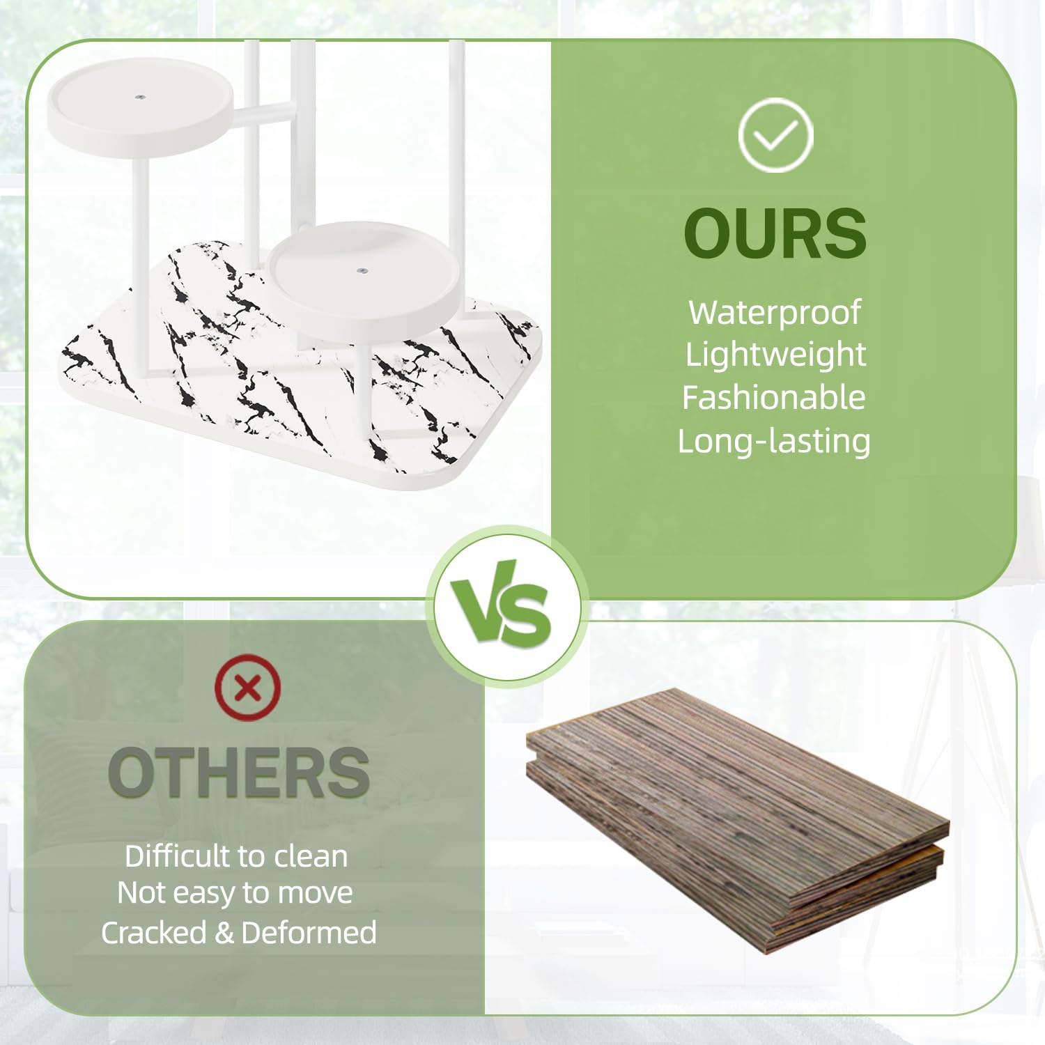 - Modern Marble-Style Base: The plant stand indoor corner's faux marble PP base adds a modern, stylish touch to your home decor. It complements contemporary interiors, enhancing your space's aesthetic appeal. Elevate any room with this elegant plant stands