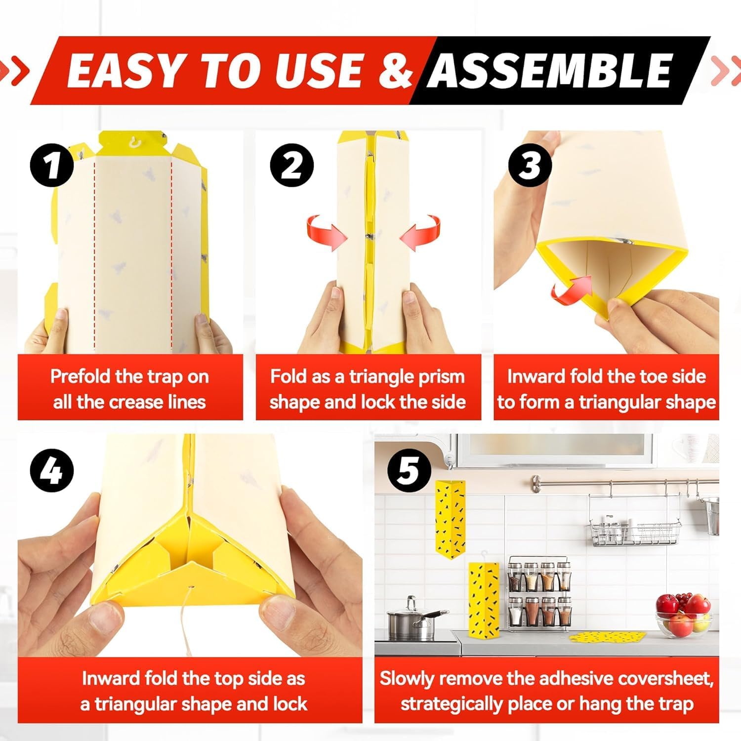 - USER FRIENDLY DESIGN: Our sticky hook fly traps are easy to set up. These sticky traps come ready to use with no mess. Simply peel off the protective cover, fold them into a triangular shape and place them strategically in high infestation areas, making pest control a breeze.