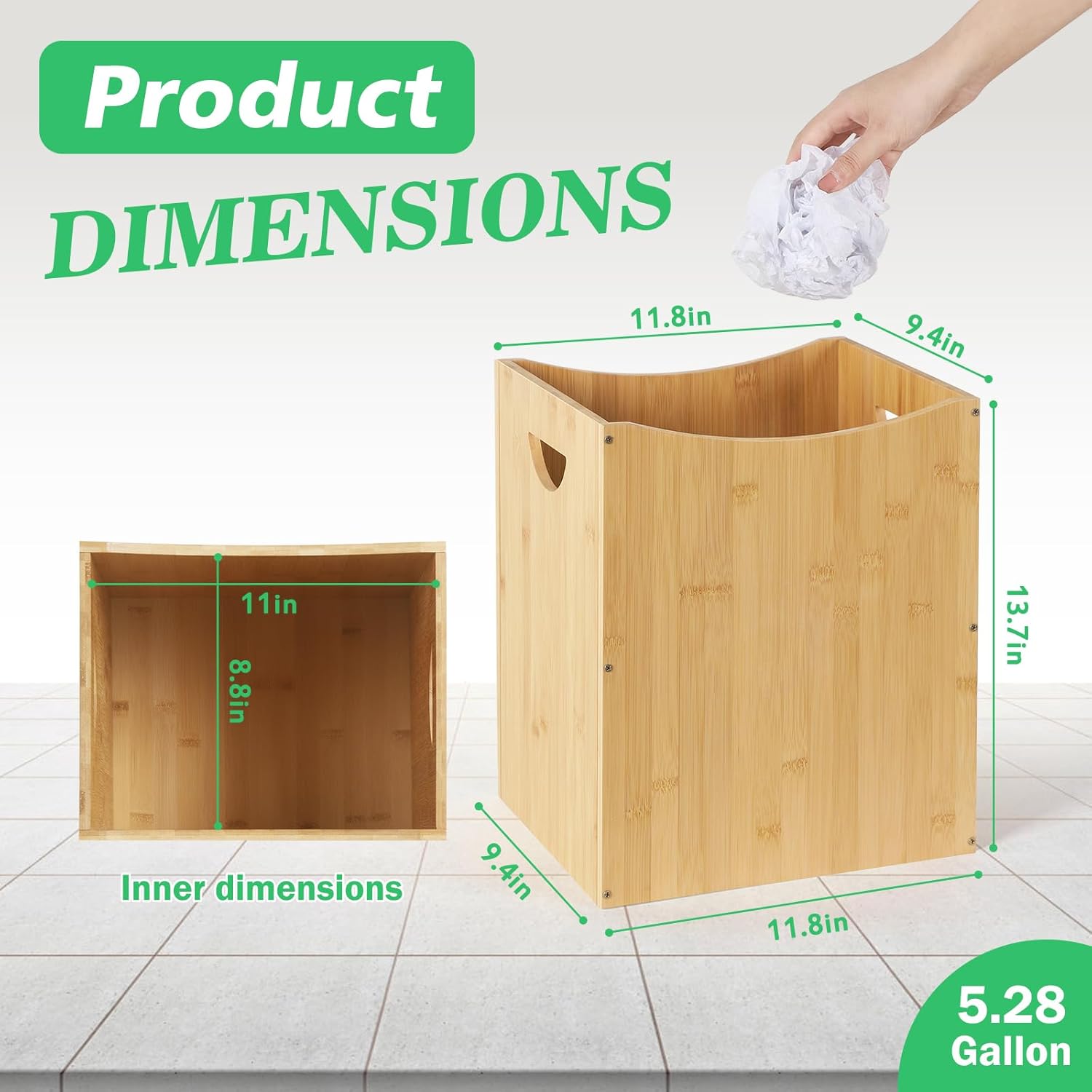 - ă5 Gallon Trash Cană Our spacious 5.3 Gallon/20L wood trash can designed with dimensions of 11.73"L x 9.69"D x 13.78"H. The design of this rectangular trash can optimizes space without compromising on size, it seamlessly fits into any corner, making it perfect for indoor cabinets, under sinks, and other tight spacesâideal as bathroom waste baskets and also for bedroom, kitchen, and office settings.