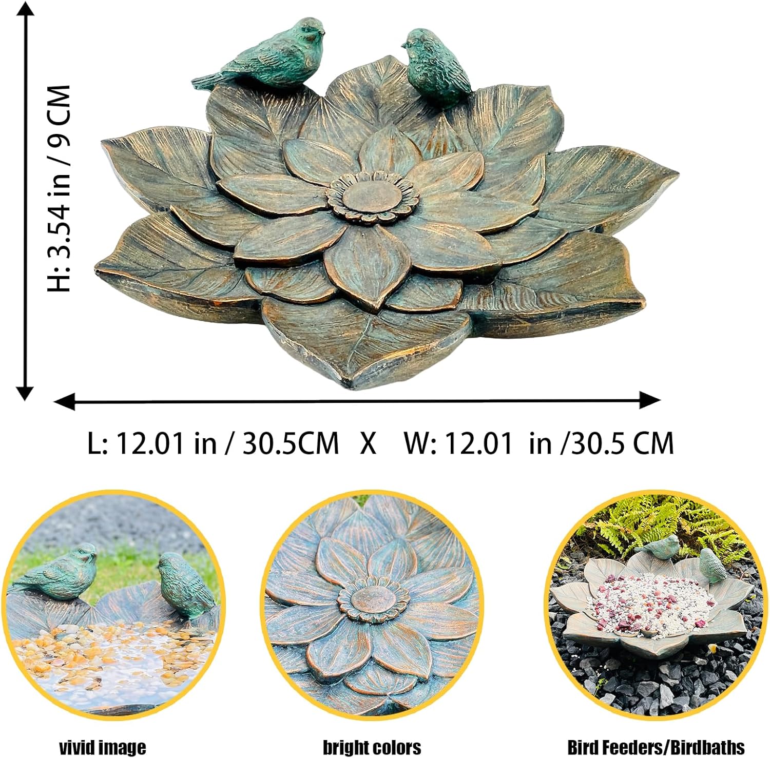 - THE PERFECT FIT: Our 12 inch wide and 3.5 inch deep bird bath serves as a bird feeder, resin bird bath, water wiggler or bubble. This bird bath bowl is ideal for decks, gardens, patios, porches, lawns, and yards of all shapes and sizes!. Quick tool-free assembly, easy for one person and ready for display in minutes.
