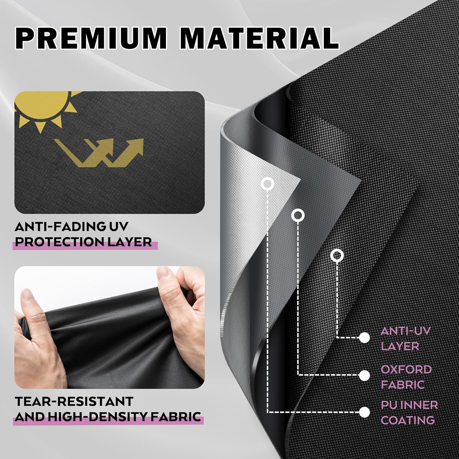 - ANTI-TEAR MATERIAL β Designed to be long lasting, this grill cover is made of high-density 420D oxford fabric with reinforced stitching, which is lightweight but durable materials that can withstand harsh weather conditions and resist tearing, fading, and other types of damage