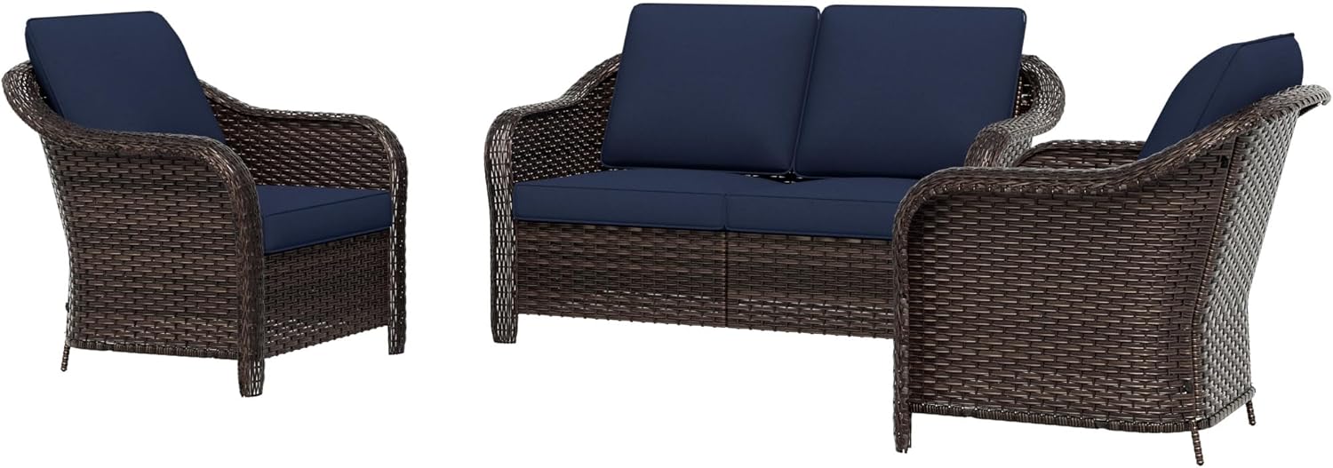 3 Piece Patio Wicker Conversation Set, All-Weather Use Outdoor Wicker Loveseat with 2 PE Rattan Chair, Ideal for Porch, Backyard, Balcony, Poolside, Blue