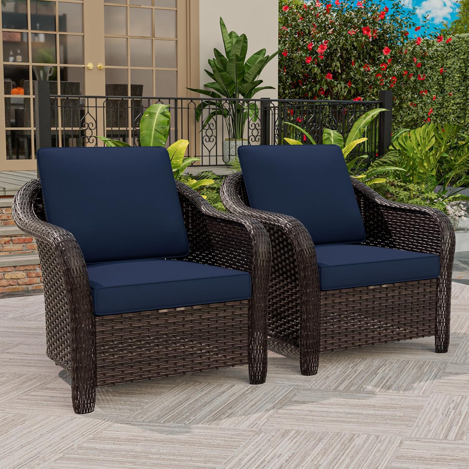 Outdoor Wicker Chair Set of 2, All-Weather Use Patio Rattan Chair with Seat and Back Cushion, Ideal for Porch, Backyard, Balcony, Poolside, Blue