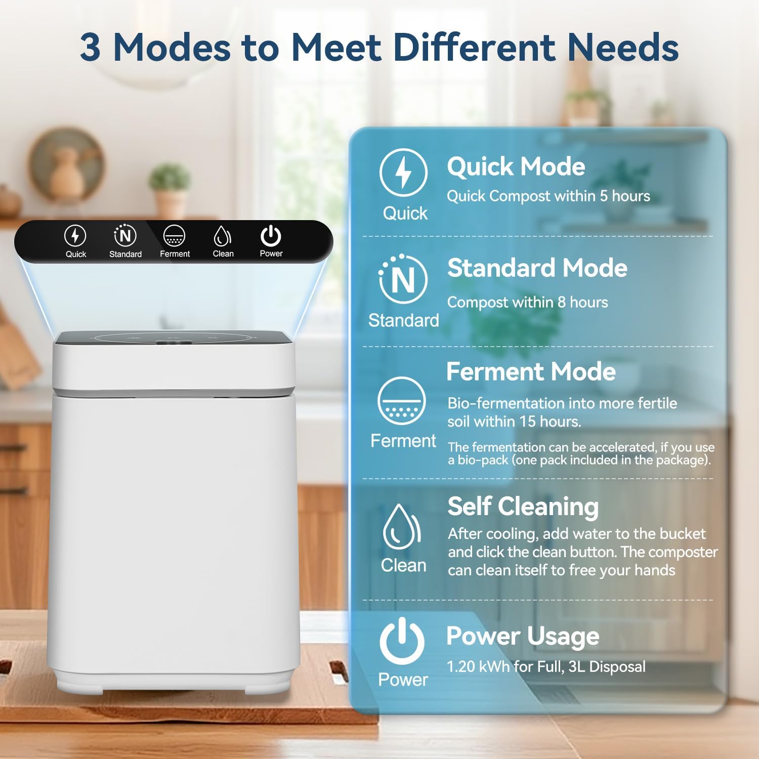 - 【Three Auto-Modes】Different from the traditional Composter, our Smart Kitchen Composter can choose 3 Modes according to your needs. The [Standard Mode] can convert kitchen waste into fertilizer for your garden plants within 8 hours. To save time, the [Quick Mode] only needs 5 hours. In addition, the [Ferment Mode] can make the fertilizer more nutritious, and the bio-pack(included in the package) can speed up the fermentation.