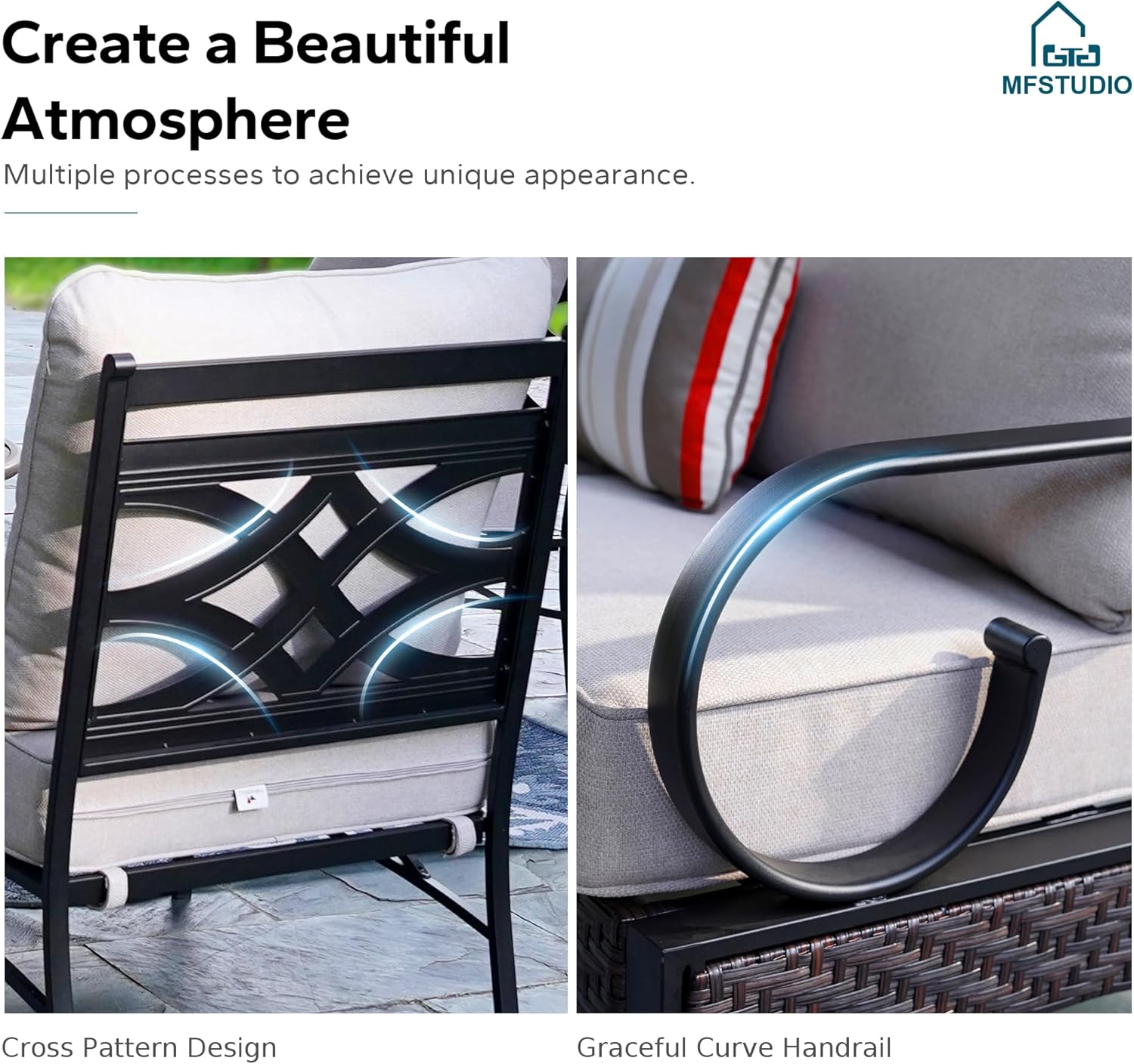 - Comfortable Cushions: MFSTUDIO 5.5" Thicker cushions have Cushion-Pro Technology, which have excellent water, oil and stain resistance. All the cushions are filled with high-density sponge. Each cushion cover features Velcro and zipper, which help secure the cushion in place to prevent slipping, and make the cover easy to remove and wash