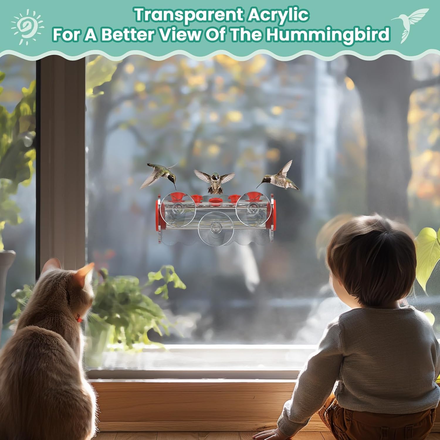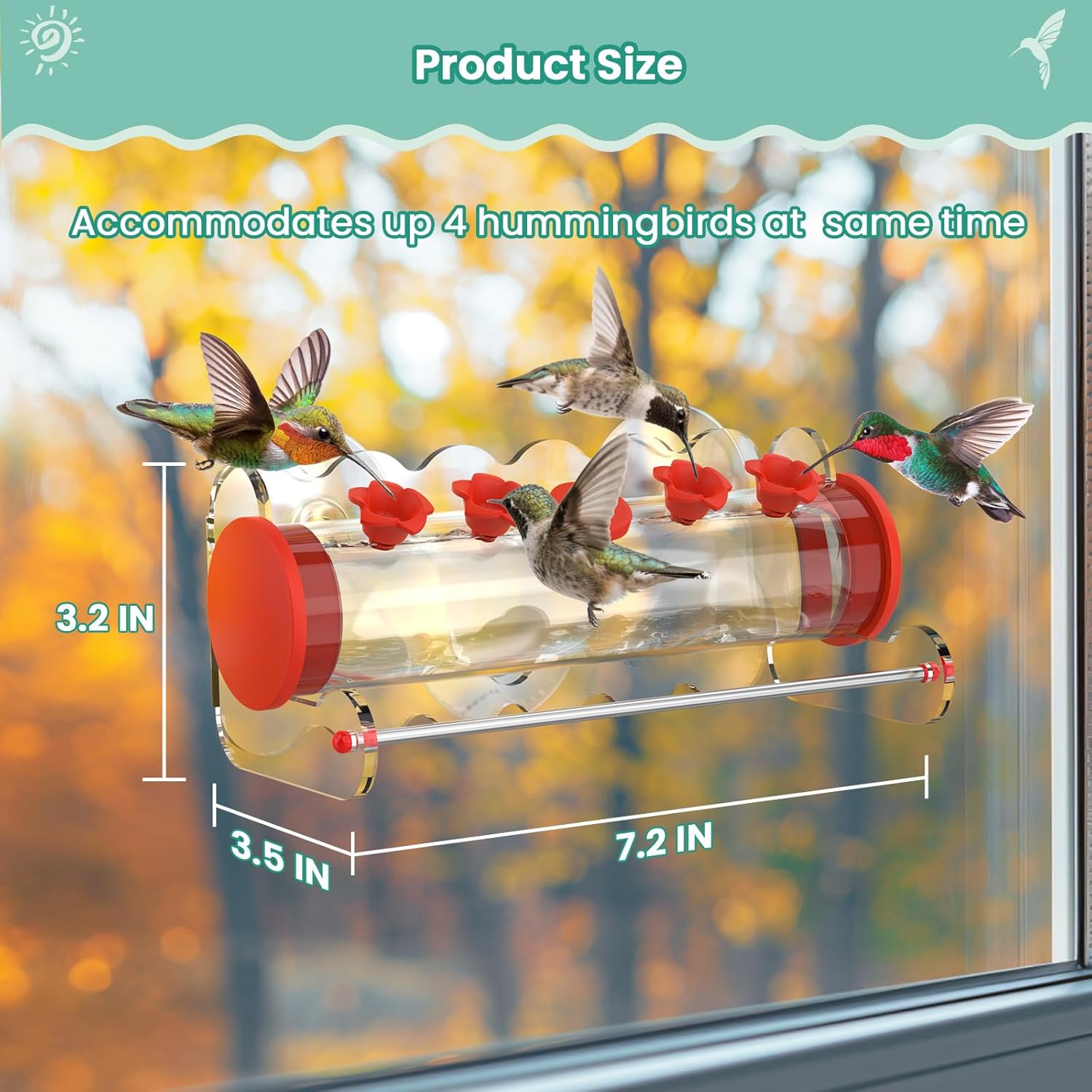 Window Hummingbird Feeder 10oz,4 Feeding Ports with Leak-Proof Design & Ultra Strong Suction Cups,Durable Plastic Bird Feeder Easy to Clean Refill, Outdoor/Indoor Use (Red Flower Top)