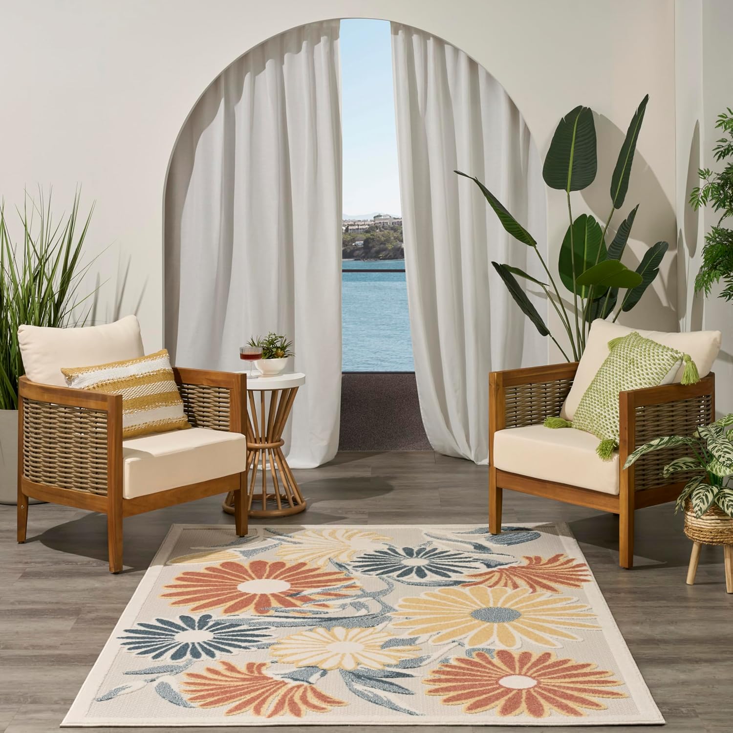 - Floral outdoor rug adds a subtle sense of depth to your space