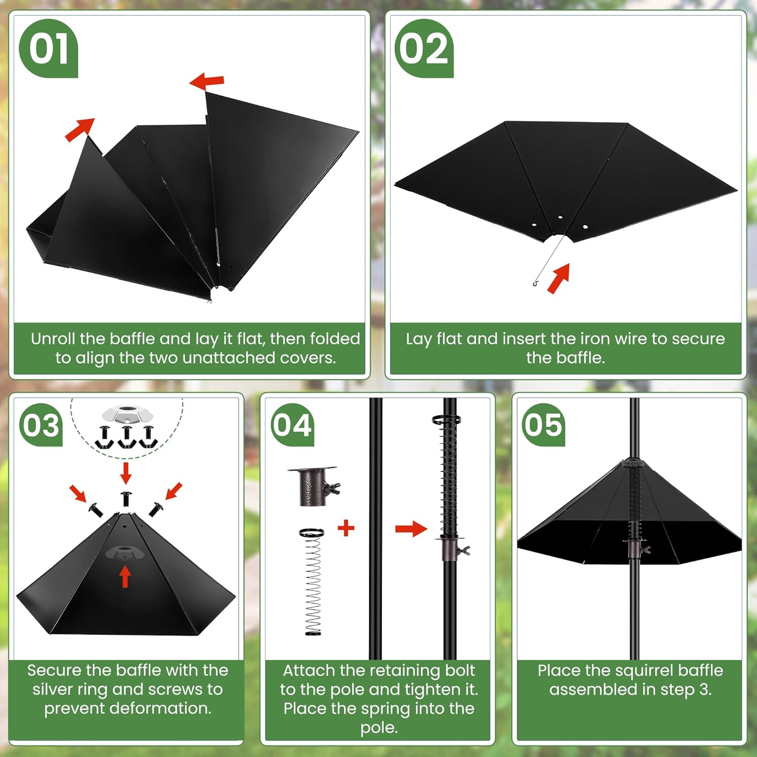 - Squirrel Proof: The newly designed metal squirrel baffle is 19 inches in diameter and is wider and larger. With the addition of the spring, the elasticity of the squirrel baffle is increased, effectively preventing squirrels and raccoons.