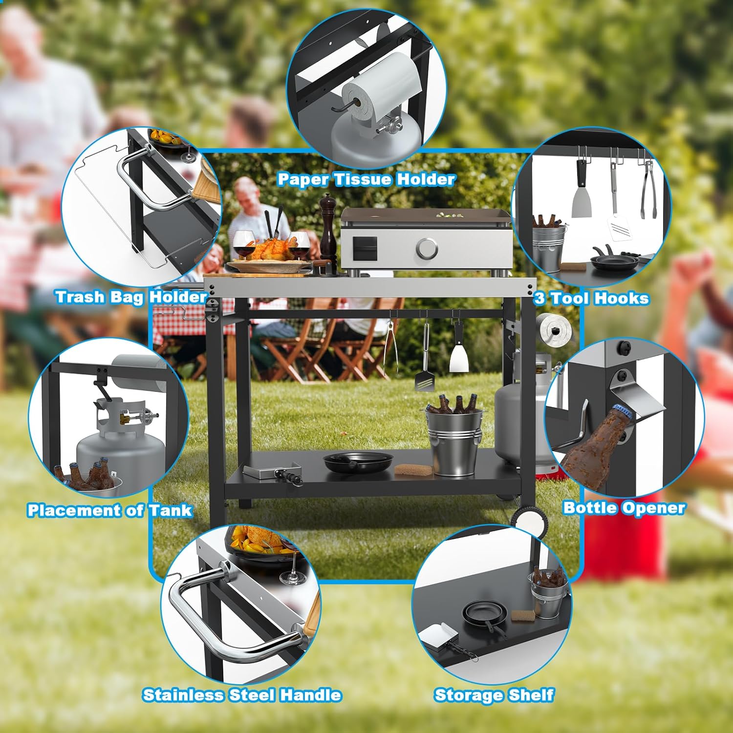 - Enhanced Mobility: Our grill table with stable directional wheels and stainless steel handle make outdoor cooking super easy. You can move them around your patio or garden with no hassle. Enjoy full control over your cooking setup and have a hassle-free outdoor cooking experience!