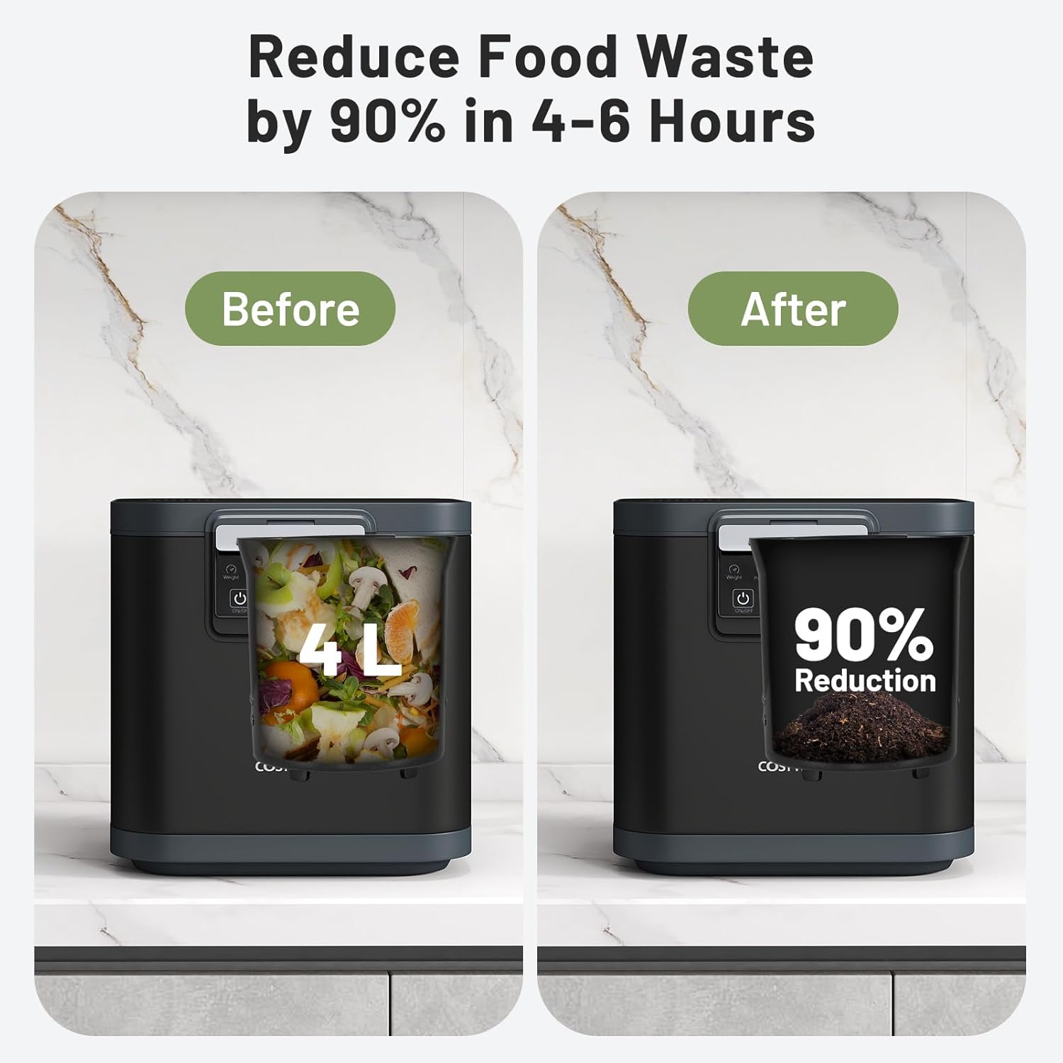 - High Capacity Composting: Capable of handling up to 4 L/1 Gallon of daily kitchen waste, the compost bin impressively reduces food waste by 90% in 4-6 hours, turning your food waste into renewable energy and fertilizer.