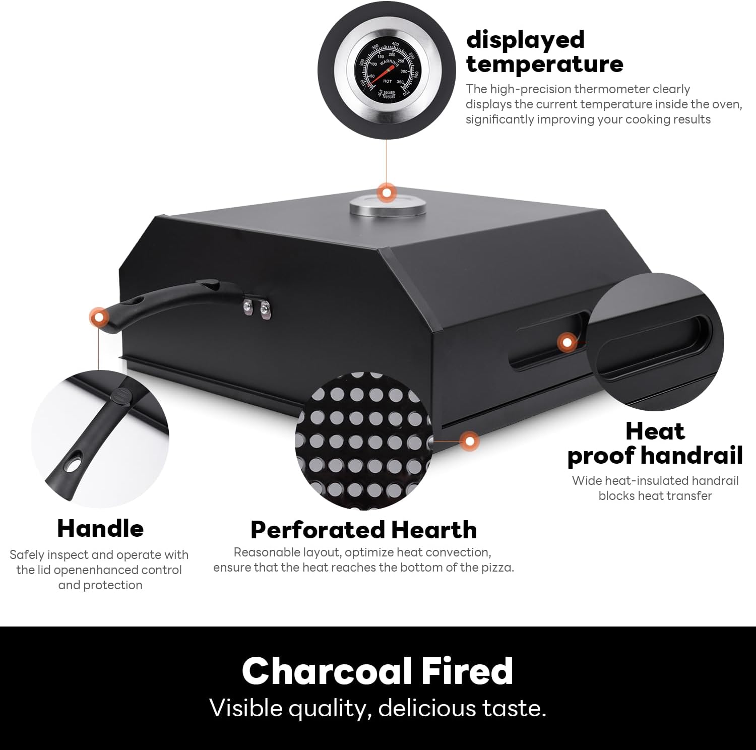 - 【Safe insulation material】The front handle of the pizza oven is heat-resistant, and high-temperature operation does not burn hands; The all metal body is sturdy and durable, suitable for repeated use.